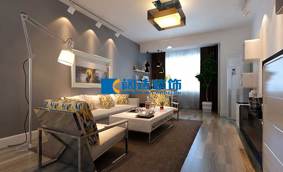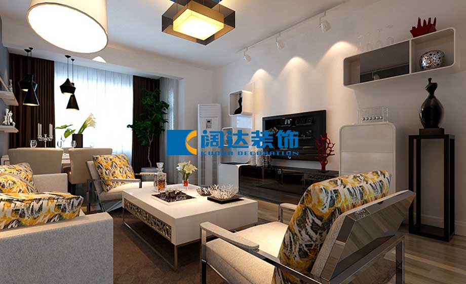 客餐廳:整體色調以簡單的純白色為基調,沙發背景墻配以現代感強勁的灰色,增強立體感。陽臺區域打通,餐桌放置在采光好的原陽臺,利用原梁放置餐廳燈,配以強化復合多色拼接地板,輔助光源射燈和點綴色軟裝黃色抱枕起到畫龍點睛的作用,整體顏色過渡流暢,對比恰當。