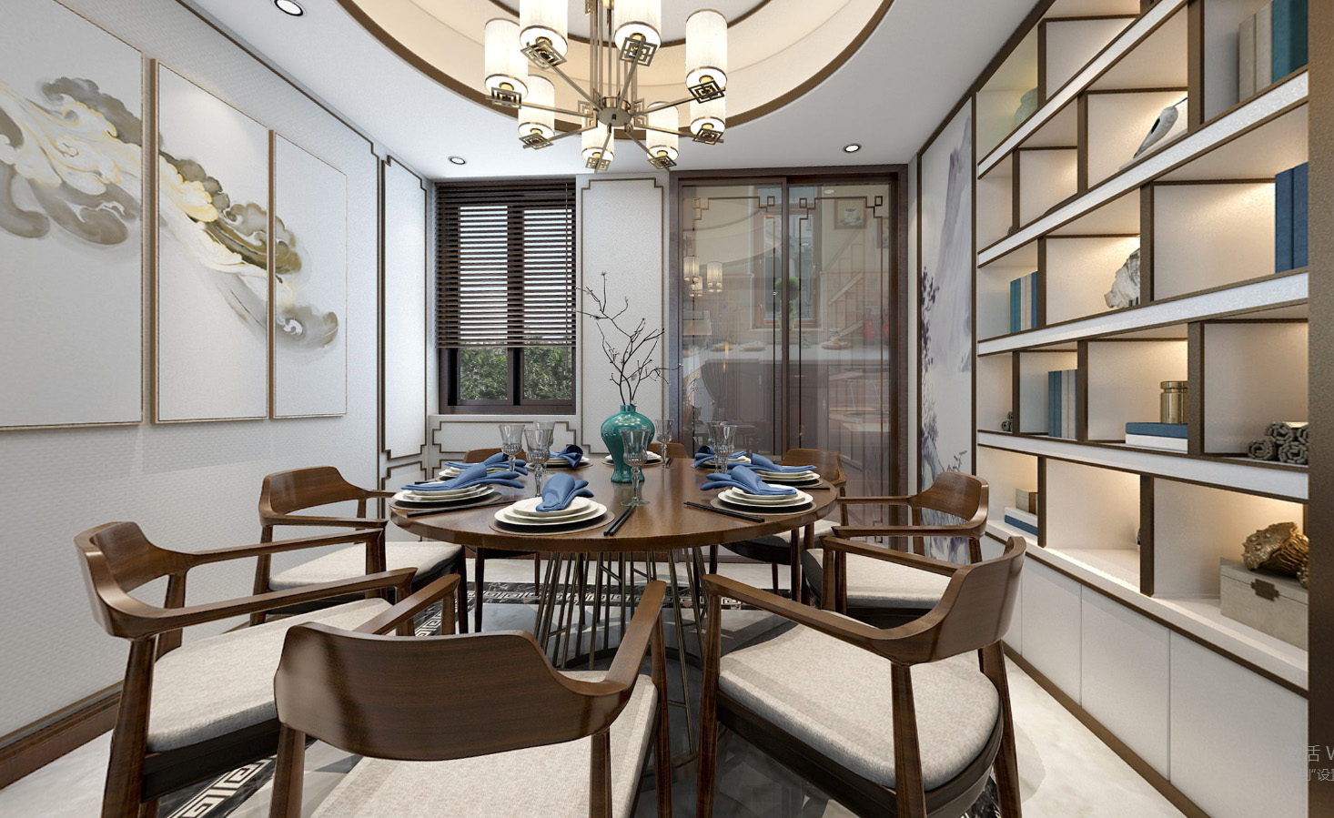簡約的空間形制,給予人一種回歸自然、俯仰自得的圓融自在感,傳統而溫馨的圓桌,中式青瓷搭配肆意生長的枝椏,別有一番鮮麗動人的意韻,居住的詩意成了狹小空間里的一小片風景。